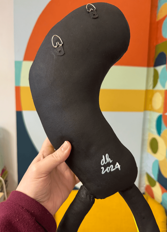 These OoAKies were made to hang on the wall, and were featured as part of an installation piece called "rumpus", on view in the "art/work + color/play" exhibition, at the Maryland Institute College of Art's Pinkard Gallery, in January 2025.